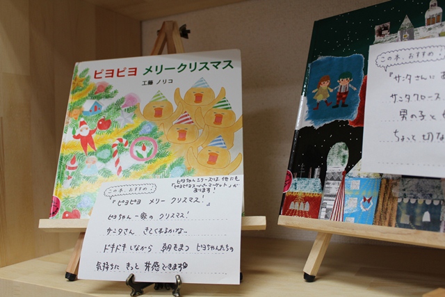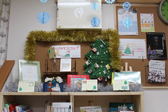 とある司書ボランティアさん達の協力の元、POPや飾りなど、多種多様なディスプレイができます。本当にありがとうございます。もちろん、12月は、クリスマスフェアー!!