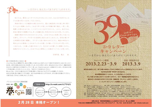 まもなく、大震災から2年になろうとしています。ここ石巻では、震災から2年を前に『3.9レターキャンペーン』と名付けて、今まで石巻に来て下さったり、ご支援頂いた方達に向けてありがとうの気持ちをこめて手紙を送るイベントを行います。