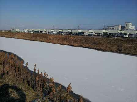 なお、三反走仮設団地の横の川の上が、朝9時時点では、氷で覆われていました。スケートができるかどうかは、試す勇気はありませんが。