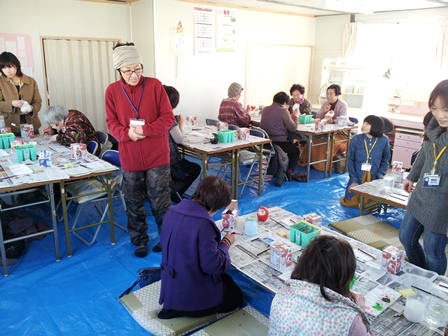早くから、おじいちゃんやおばちゃんたちが来てくれ、皆さん、本当に熱心に作っていました。ただ、この団地は、間垣と言う大川小学校の学区にある地域から来られた方達で、ご家族を亡くされた方も多く、人の顔に似せるのは誰かを思いだし辛いものがあるのか、涙を流された方もいらっしゃいました。
