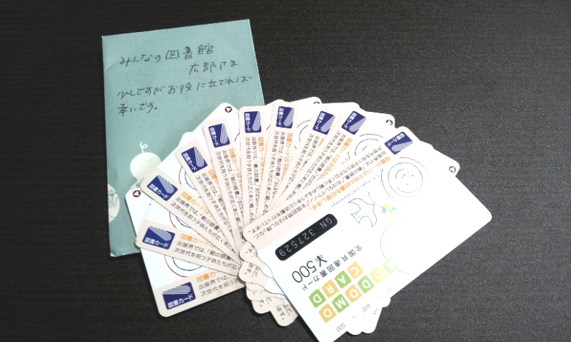 昨日、群馬からはるばる来てくれていた、みえさん(ボランティア仲間)が、一階のみんなのとしょかん用に、図書カードを持って来てくれました!