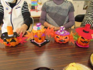 参加された方は顔の位置をどうしようかと、パーツをかぼちゃにくっつけながら考えている姿や周りと見比べながら飾りをつけようなど選択している姿が印象的でした。