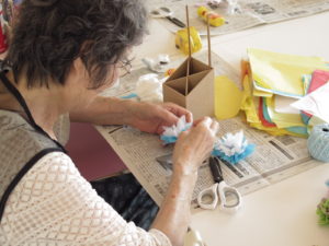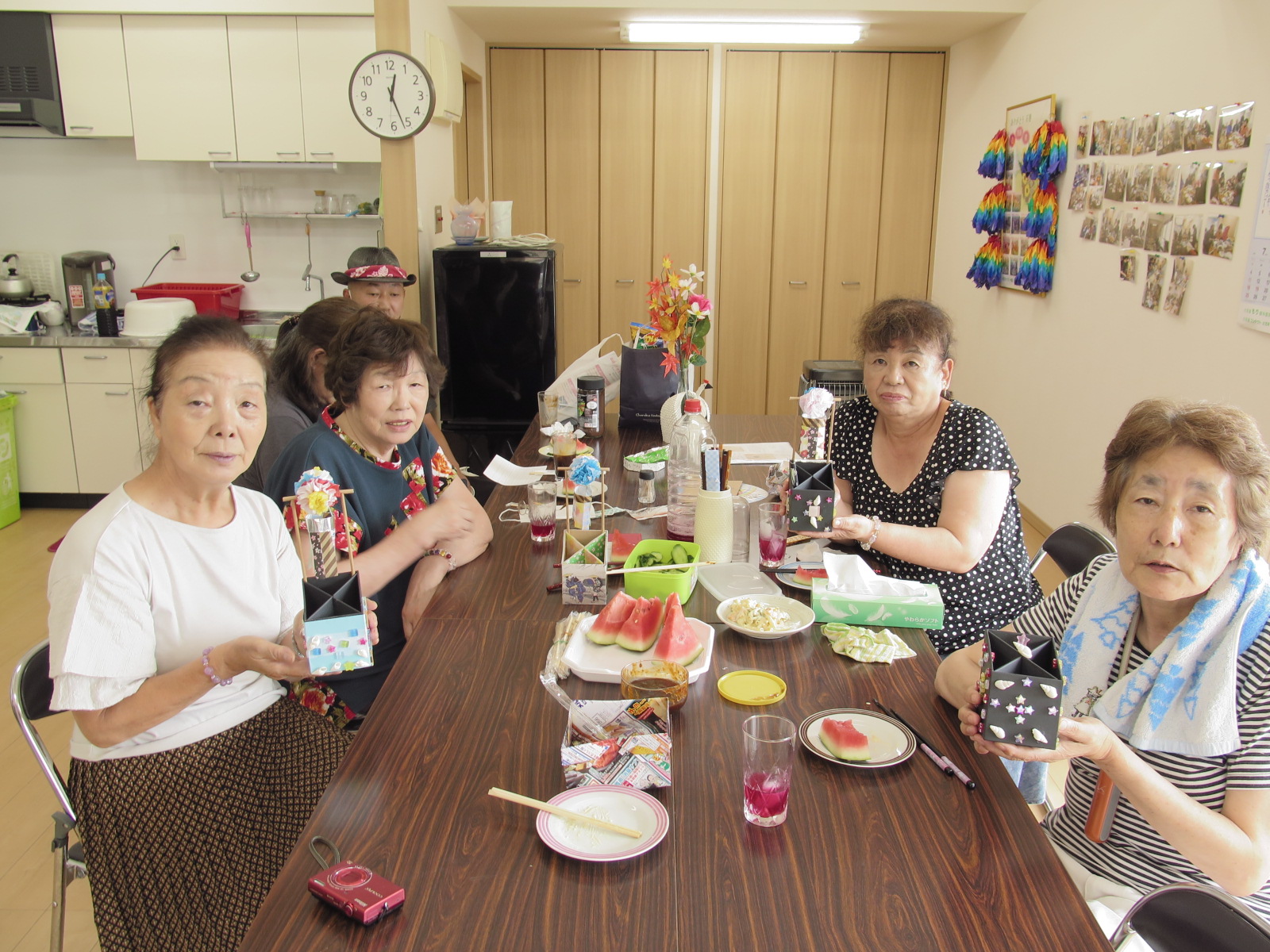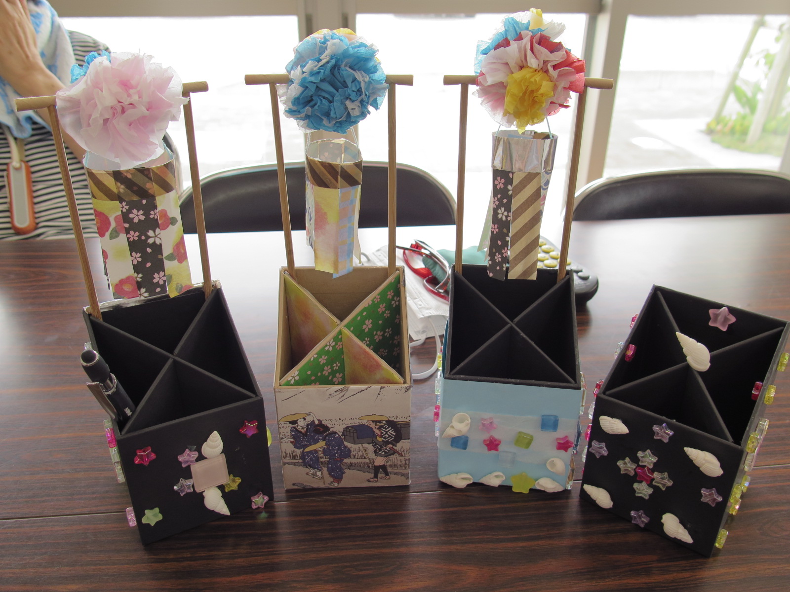 折り紙や飾りをたくさん貼って豪華なペンスタンドにした方、一生懸命にフラワーペーパーを折り重ね、七夕飾りを作っていた方など、個性あふれる作品が完成していました。