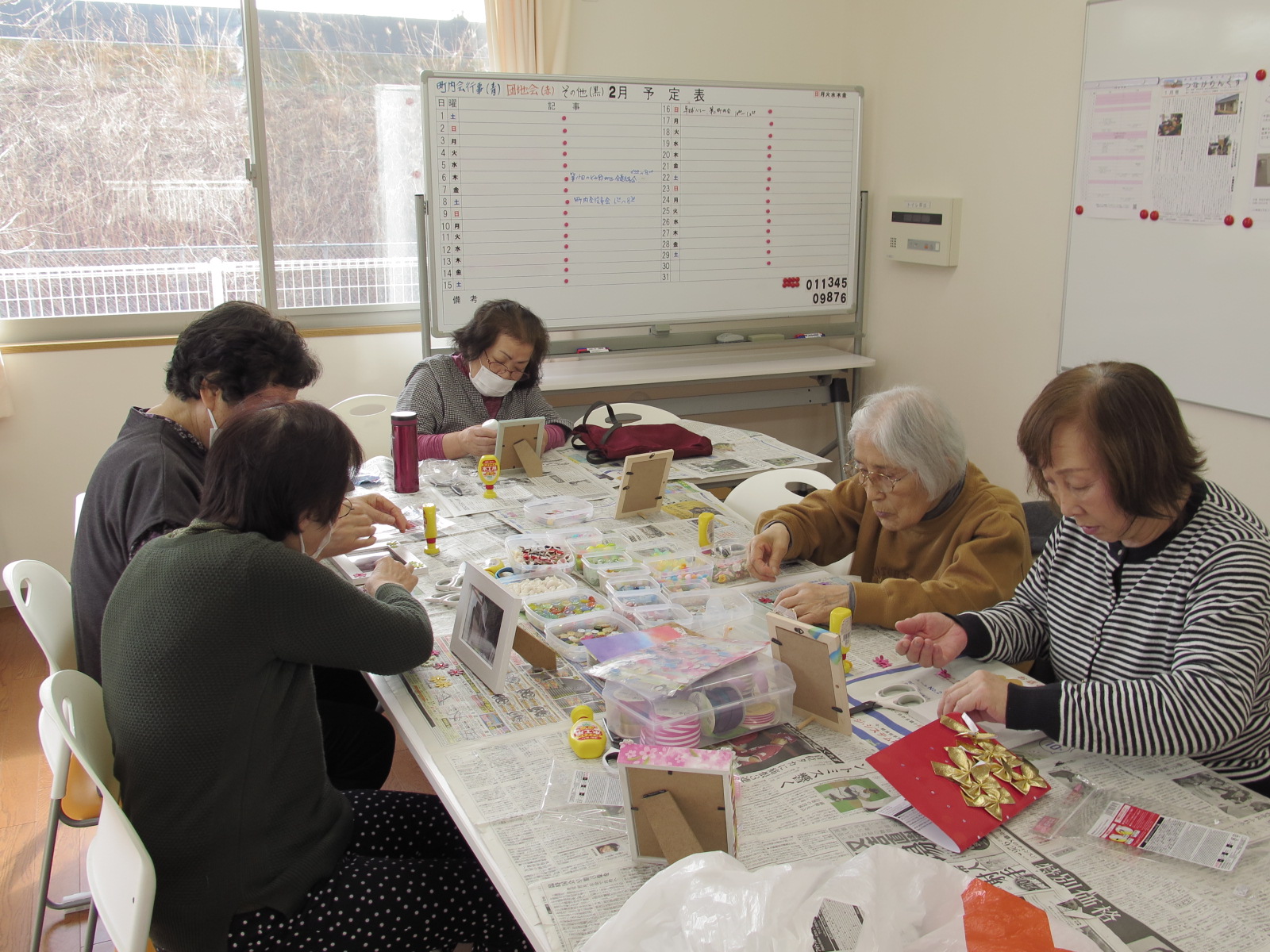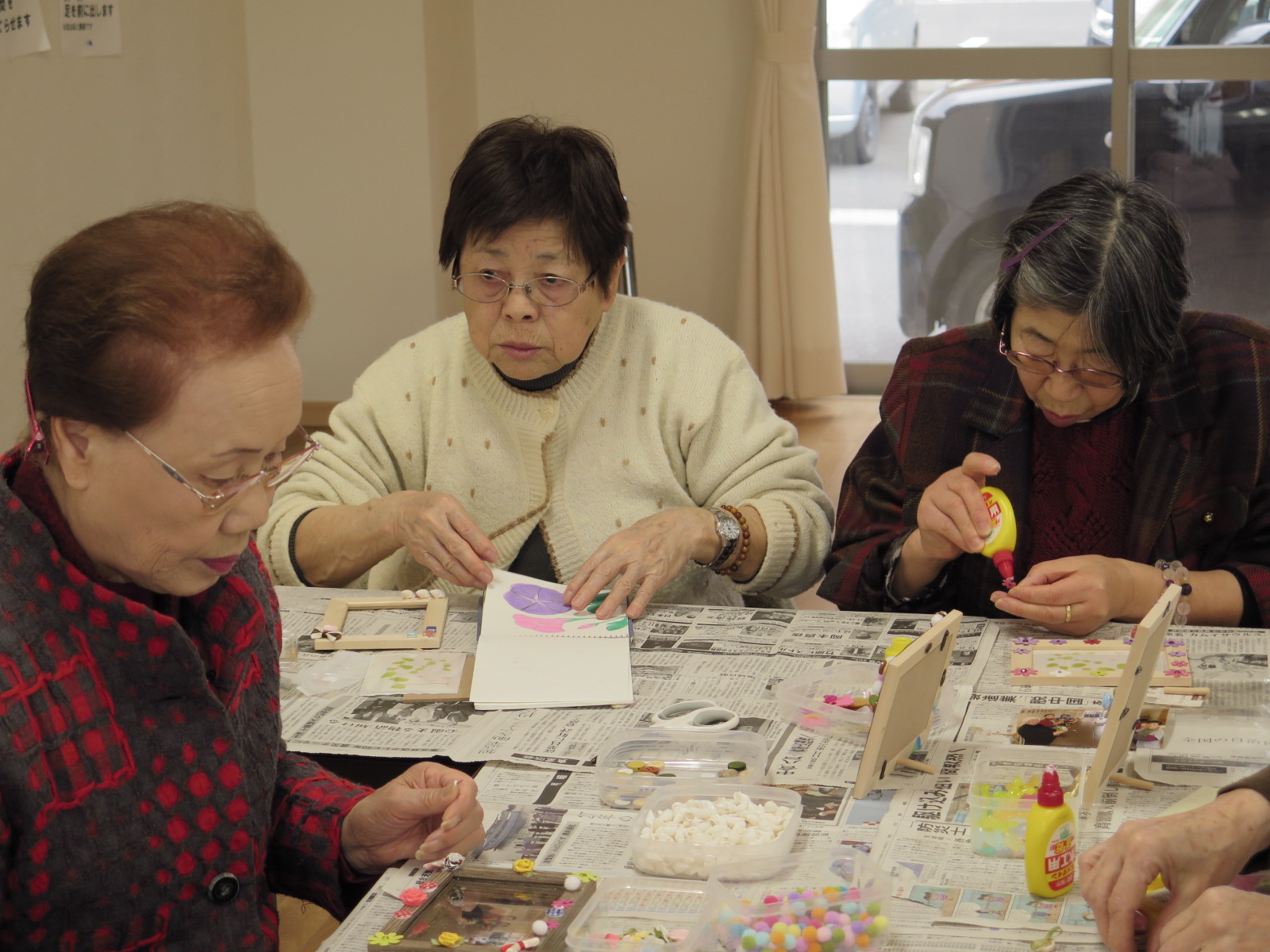 飾りを複数組み合わせてオリジナルの飾りを作り上げていたり、シンプルにあまり飾りを付けずに完成させていたりと、十人十色の個性が映えるフォトスタンドが完成していました。途中から小さい男の子を連れた親子が参加すると他の皆さんはまるで孫を見るかのように暖かい目をしていたのが印象的でした。