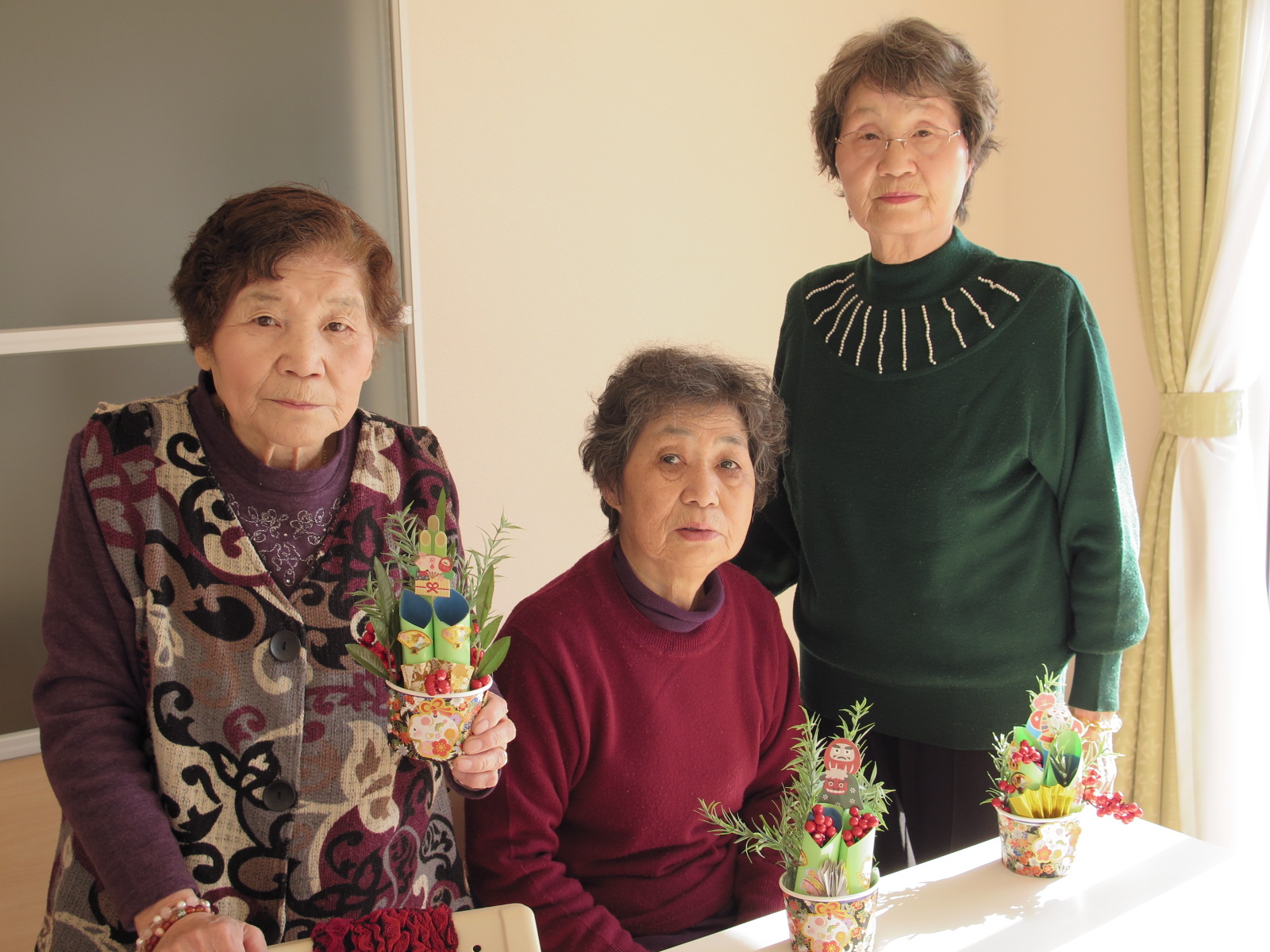 師走に入りクリスマスやお正月も間近ということもあり、キラキラとお部屋を彩るよう色々な飾りを付けたリースか、テーブルや棚の上に置ける小さな門松を皆さんに作ってもらいました。