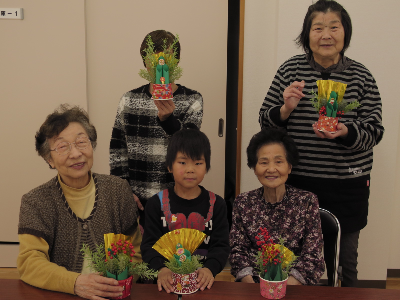 師走に入りお正月も間近ということもあり、年賀はがきに使えるはんこかテーブルや棚の上に置ける小さな門松を皆さんに作ってもらいました。