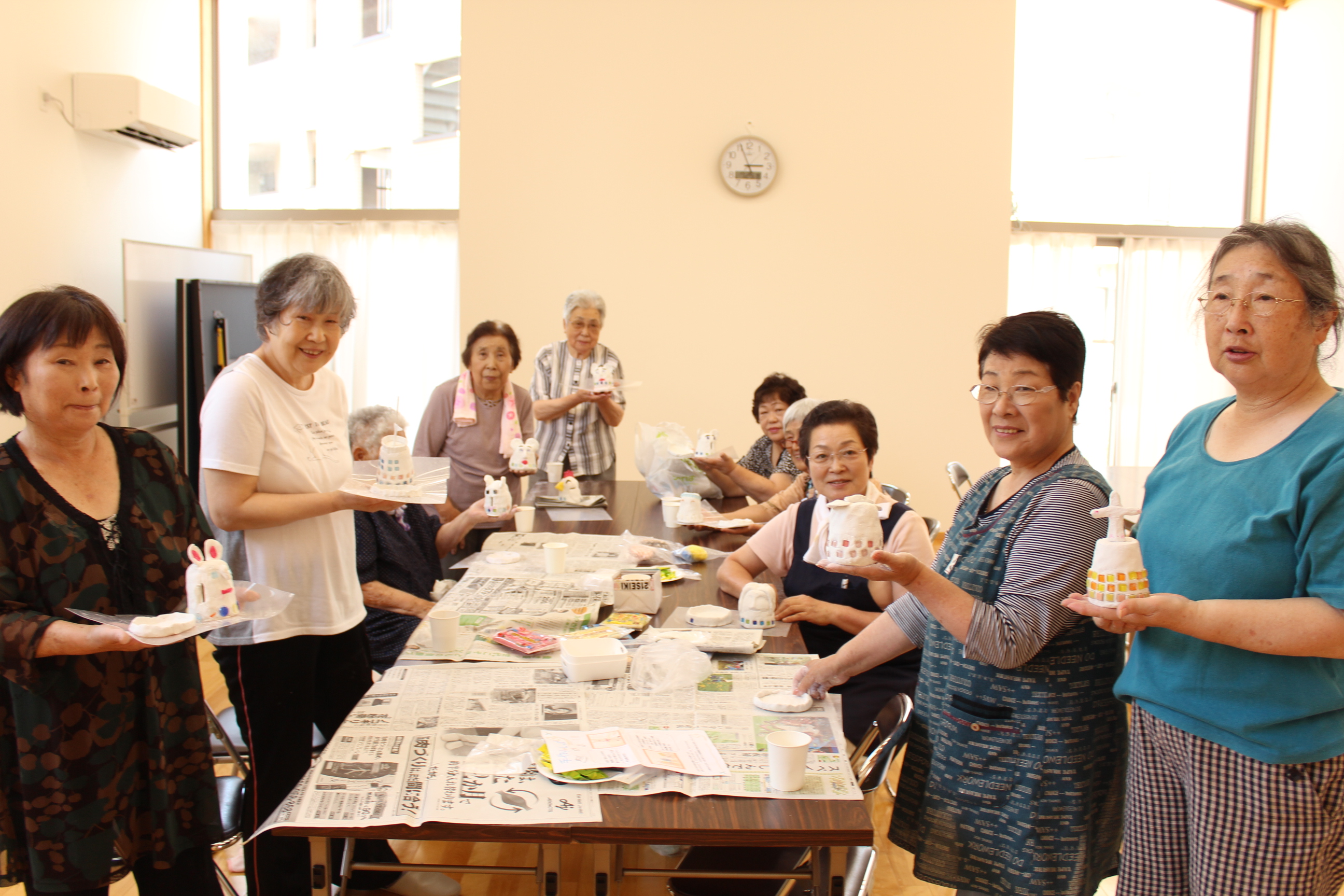 あけぼの北復興公営住宅では貯金箱部分を土台としてその上に飾りを付けるという斬新なデザインの貯金箱を作っている方がいて思わずそのアイデアにうなるようなワークショップとなりました。