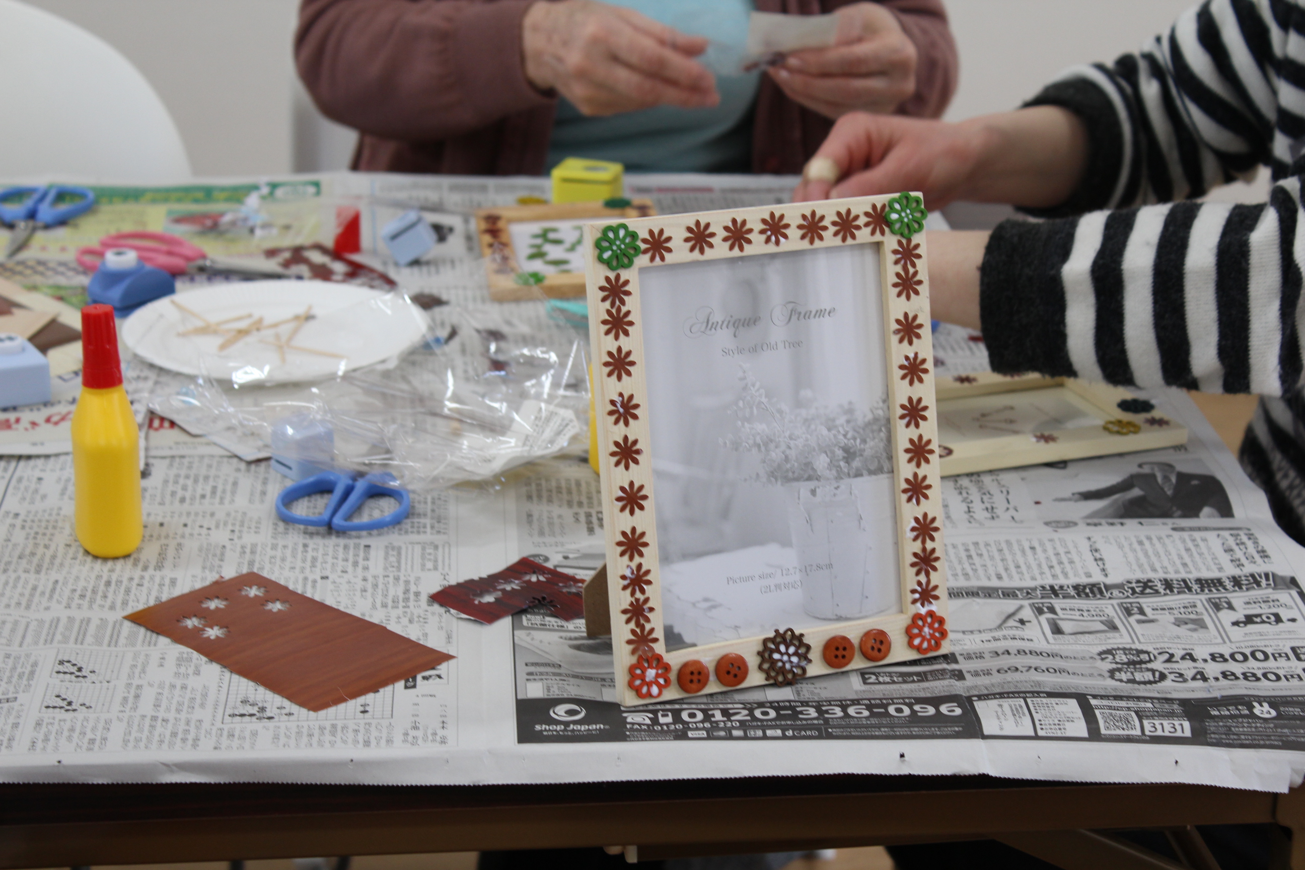 【スタッフの感想】ここの集会室ではテーブルをいくつか分けてハンドメイドしていますが、作っている間は皆さん席に座って黙々と。作り終わったら立ち上がって皆の写真立ての鑑賞会をしていました。材料に限りがあるので皆さん工夫しながら作ってくださいました。